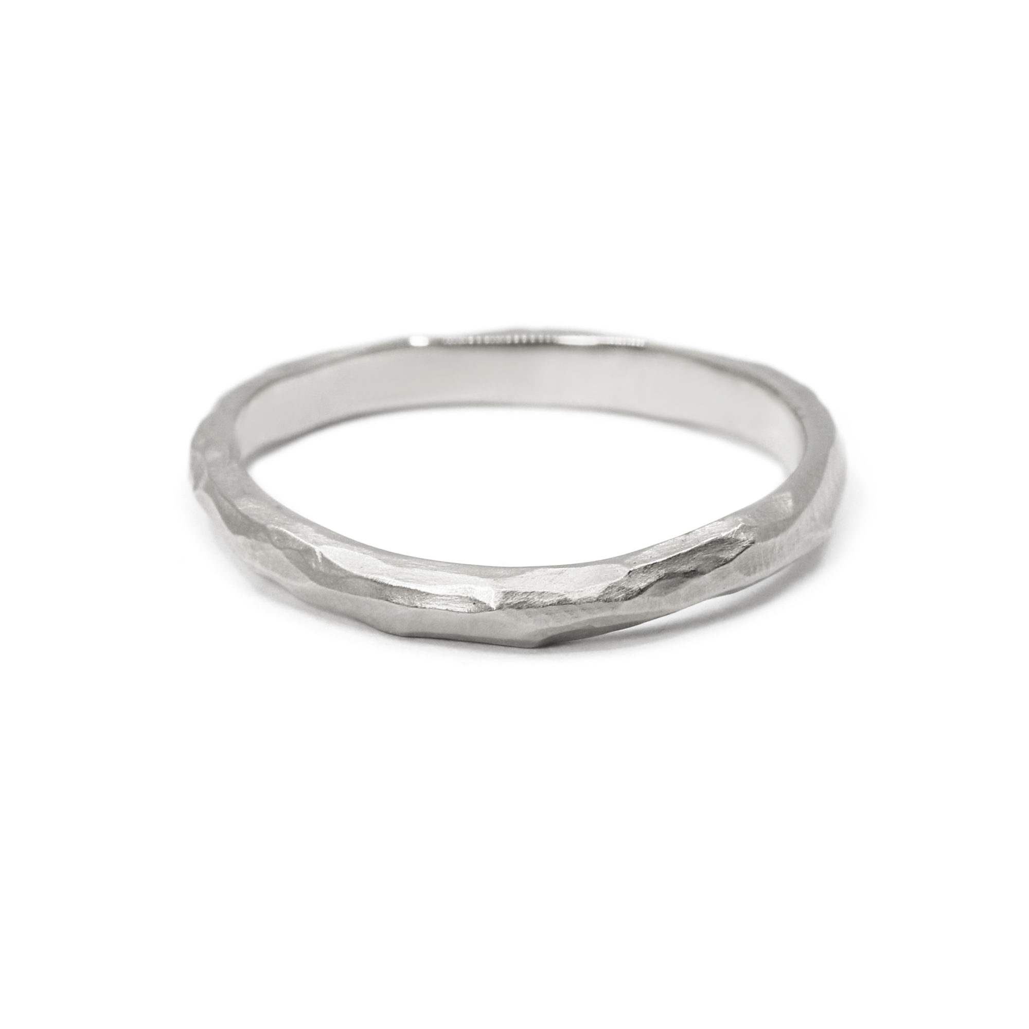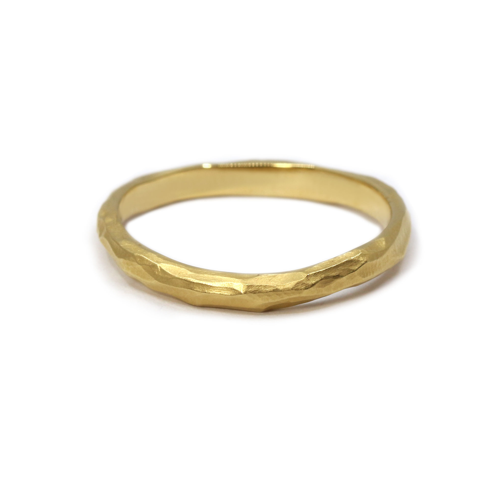 Avec sa largeur de 2,50 mm, elle trouve un parfait équilibre entre délicatesse et caractère. Sa surface, tout en courbes souples et en volumes irréguliers, capte la lumière de manière subtile, révélant des reflets doux et mouvants, loin de l’éclat lisse des bijoux industriels.