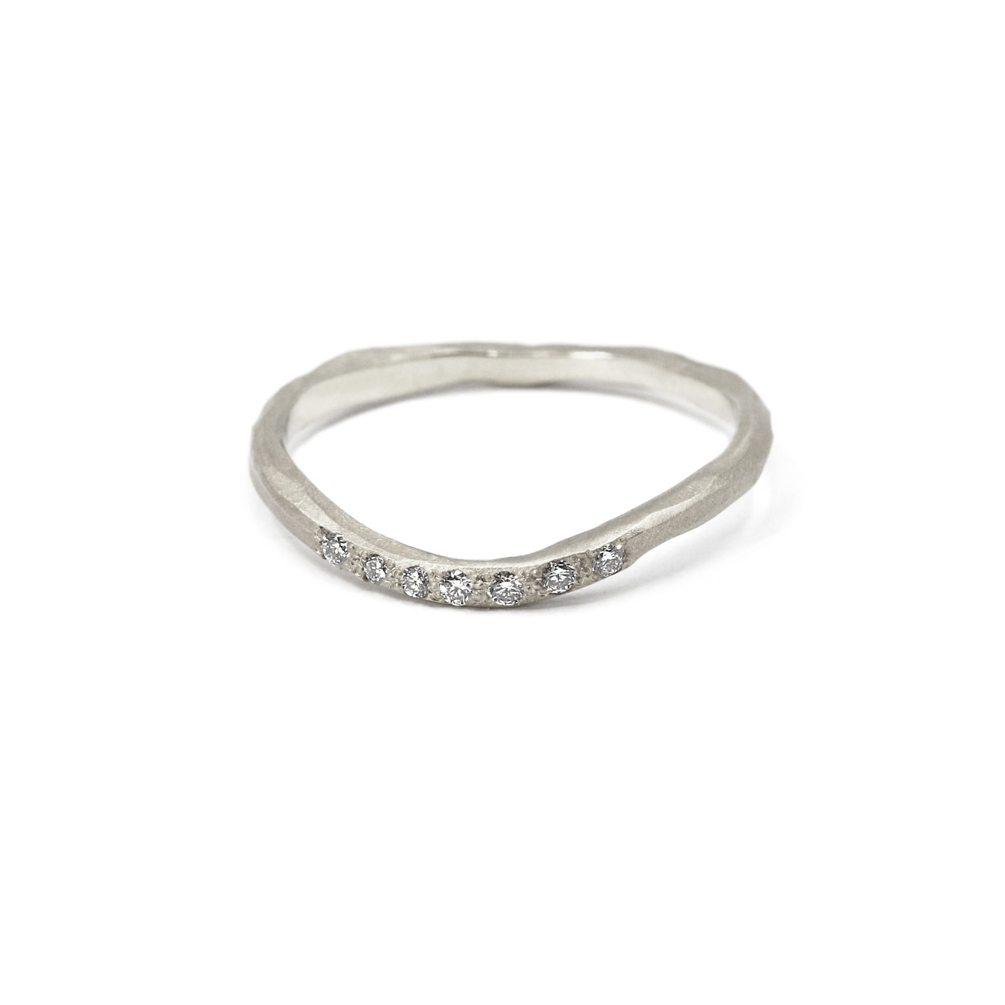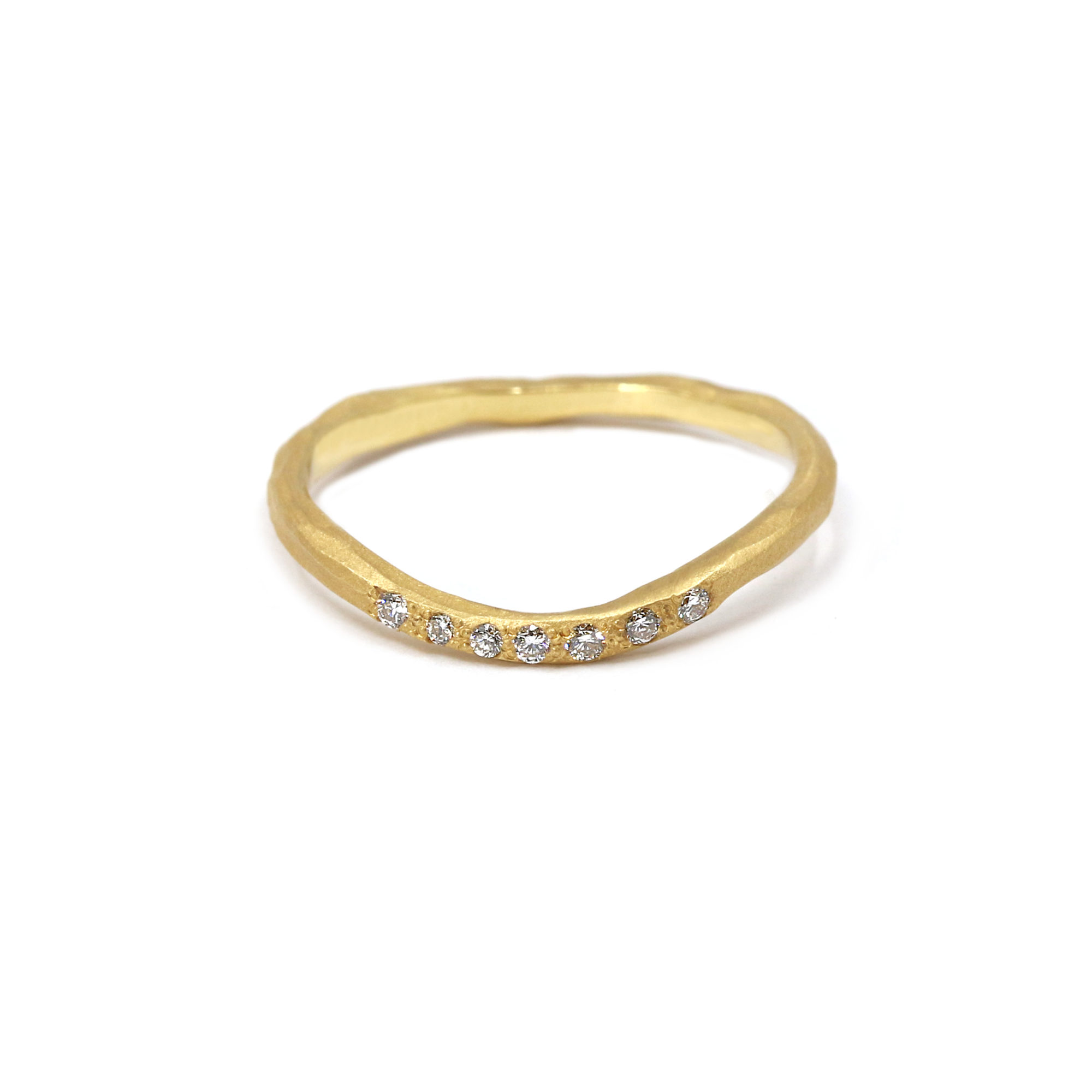 Tout autour du doigt, sept diamants de tailles différentes, soigneusement parsemés, viennent scintiller de manière inattendue, comme des éclats d’étoiles déposés au hasard. Leur brillance subtile contraste avec le velouté du métal, apportant un rythme lumineux et poétique à cette pièce singulière.