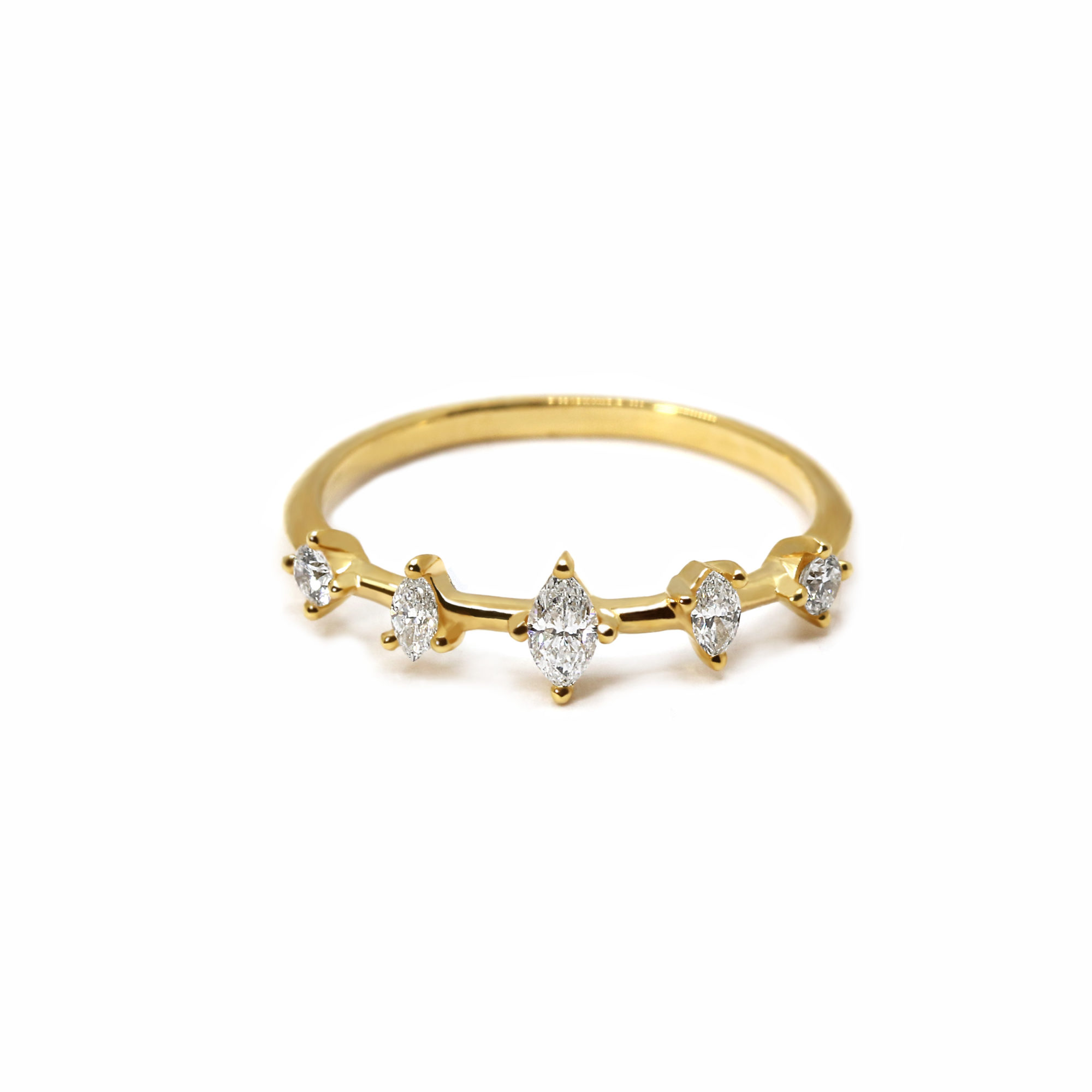 Cette bague en or 18 carats marie avec grâce la pureté des diamants et l’harmonie des formes. Elle se distingue par une composition délicate : trois diamants navette, aux lignes élancées et scintilantes, alternent avec deux diamants ronds taille brillant, apportant équilibre et contraste à l’ensemble.