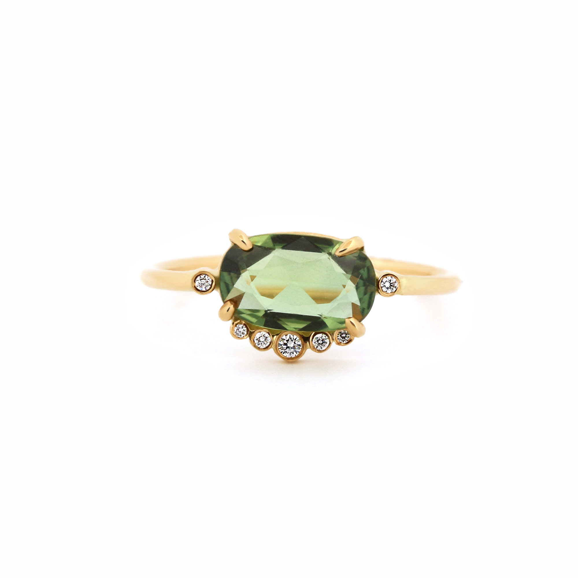 Cette bague en or jaune allie caractère brut et élégance raffinée. En son cœur, un saphir vert olive transparent, de taille irrégulière et plate, capte la lumière avec une profondeur mystérieuse. Sa teinte végétale et minérale évoque la nature sauvage, subtilement mise en valeur par l’éclat chaud de l’or. Autour du saphir, sept diamants délicatement sertis forment une constellation brillante, ajoutant éclat et équilibre à la composition. Chaque pierre semble posée avec spontanéité, créant un effet organique et raffiné. Cette pièce singulière célèbre l’imperfection naturelle et la beauté unique d’un bijou façonné comme une œuvre d’art précieuse et vivante.