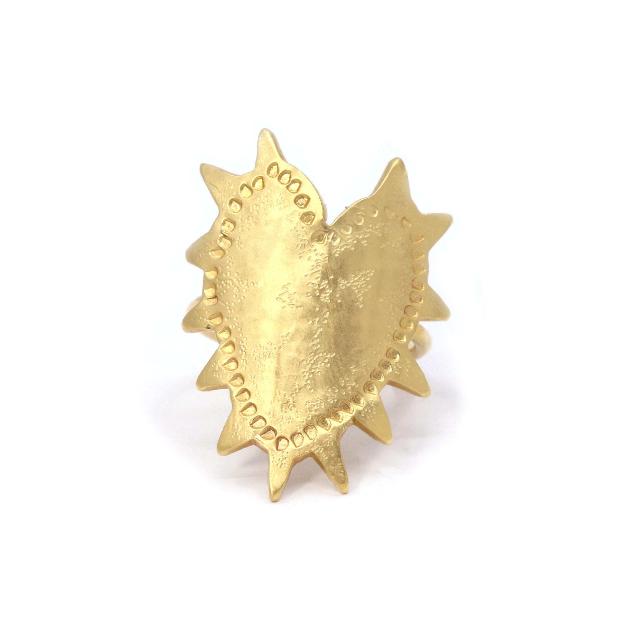 Magnifique bague ExVoto qui allie toutes les tendances avec sa médaille coeur découpée à la main et emboutie pour un effet rock et chic. Notre modèle est en argent massif trempé dans l’or 18ct.