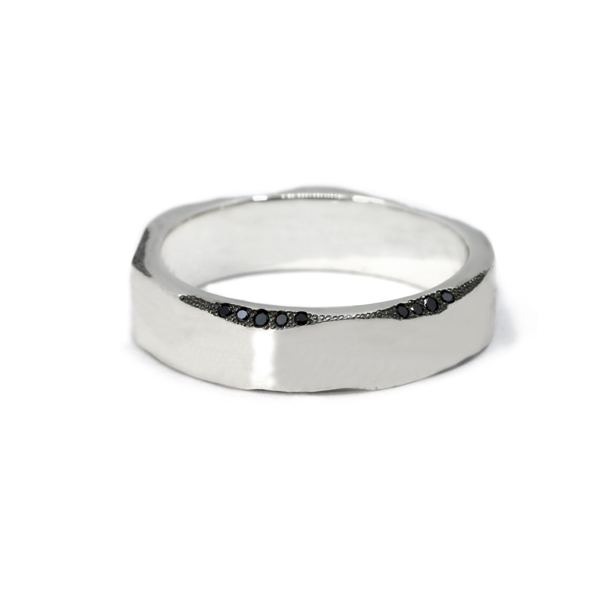 Les bords martelés à la main rappellent les fractures et reliefs d’une roche taillée. Dans ces aspérités naturelles sont sertis de minuscules diamants noirs, sertis comme des minéraux sombres dans la matière argentée. L’ensemble crée un effet minéral saisissant, où la lumière se joue des contrastes entre matité, texture brute et éclats sombres.