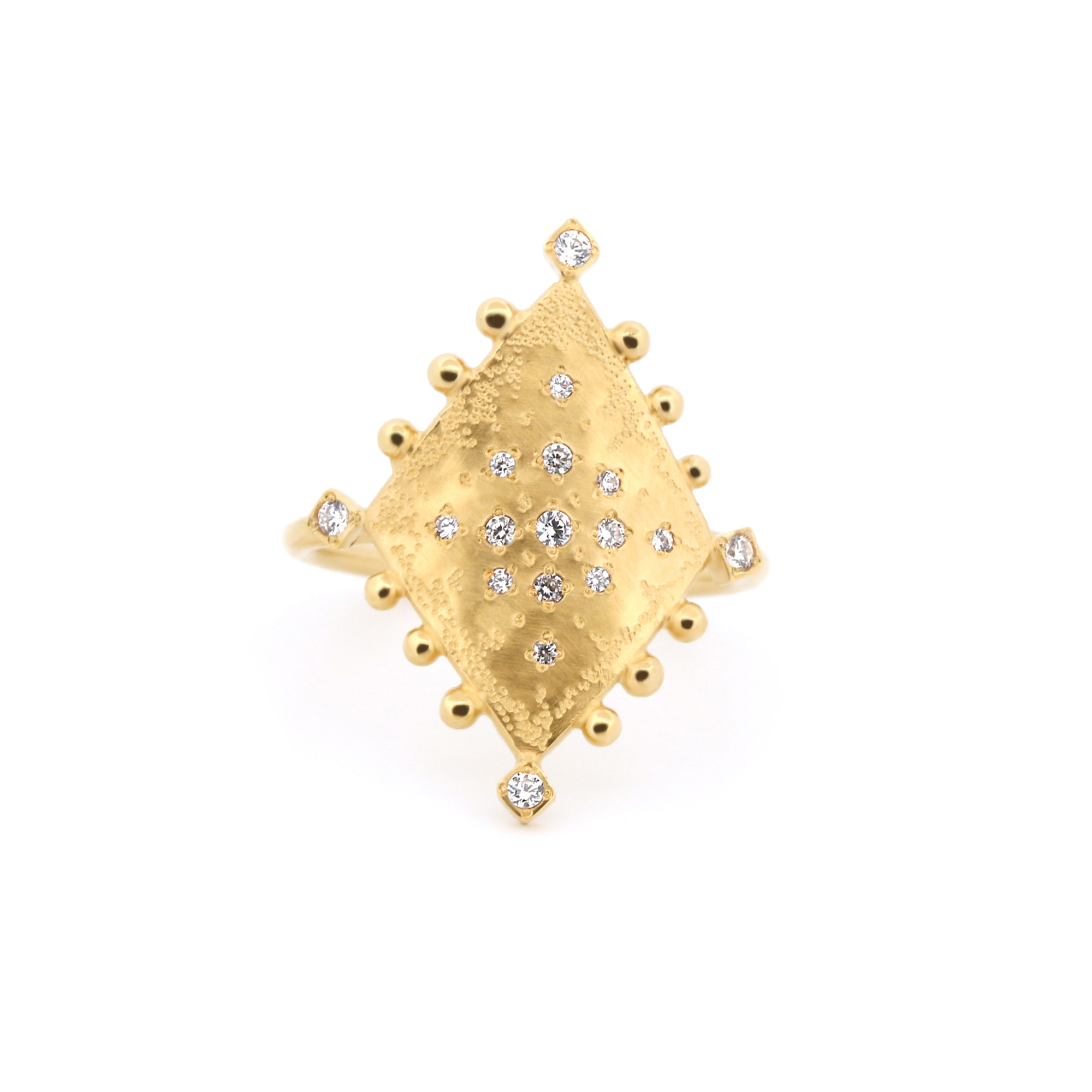Le contour du losange est subtilement souligné de petites boules dorées, qui forment une bordure texturée et apportent du relief à l’ensemble. Ce travail minutieux rappelle les finitions artisanales et confère au bijou une allure à la fois précieuse et singulière.