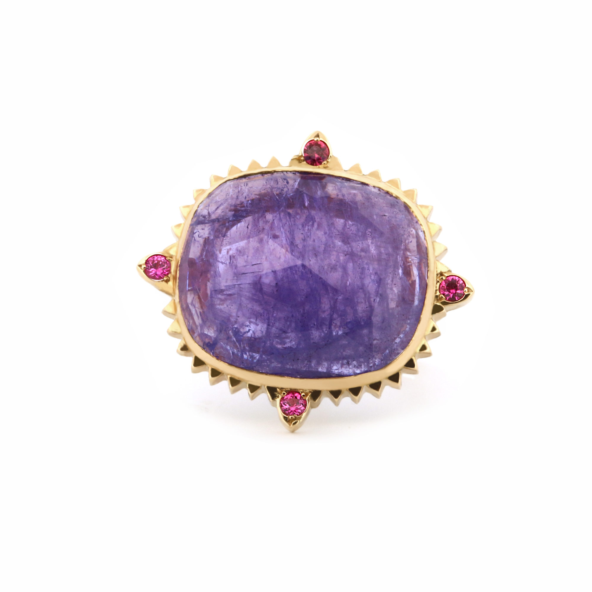 Bague en or jaune 18ct recyclé surmontée d’une tanzanite entourée de quatre saphirs fuchsias.