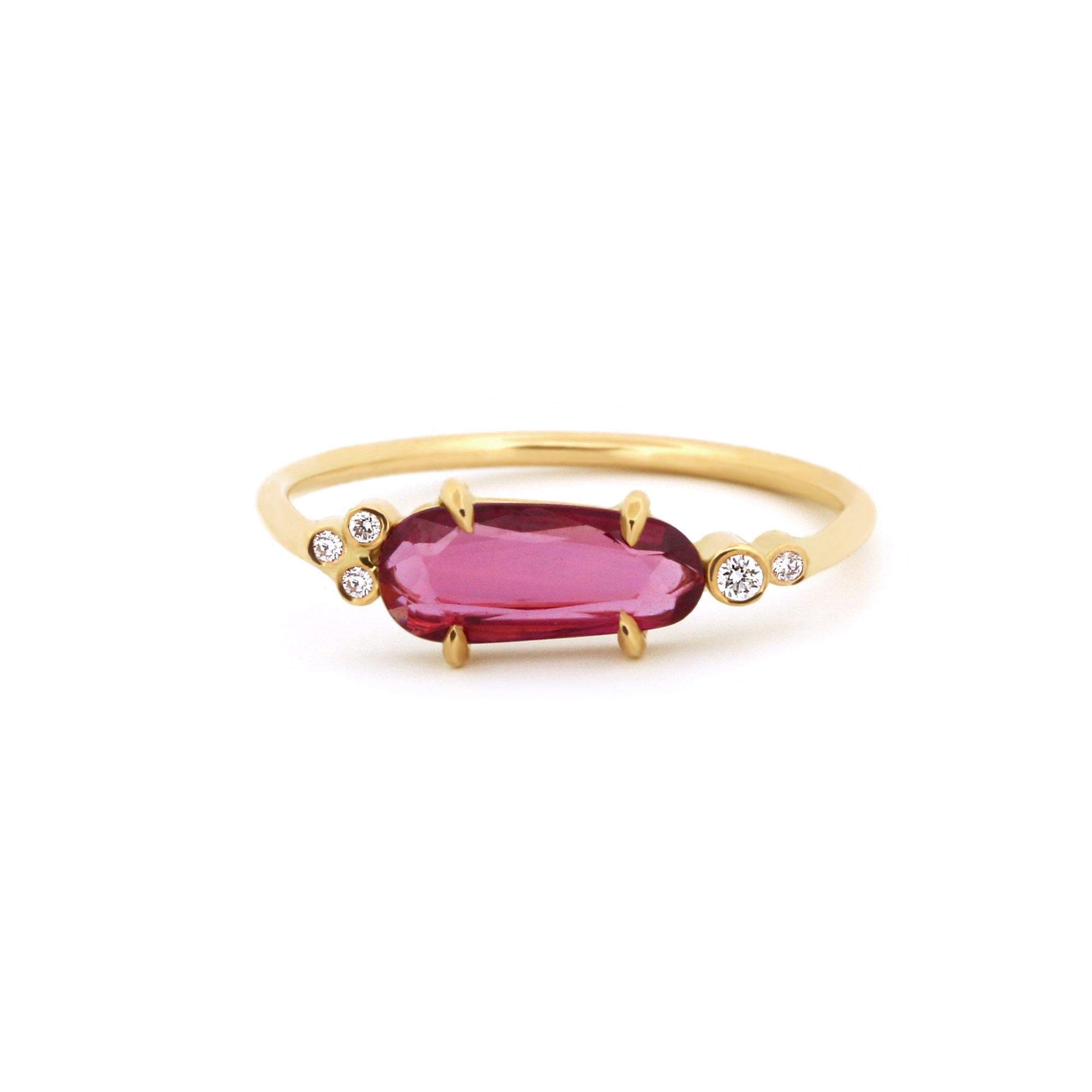 Autour de cette gemme intense, cinq diamants finement sertis apportent une touche d’éclat pur, jouant avec la lumière pour souligner le feu du rubis. L’or jaune, chaud et noble, enveloppe l’ensemble avec finesse, révélant une pièce unique, à la fois précieuse, expressive et subtilement contemporaine.