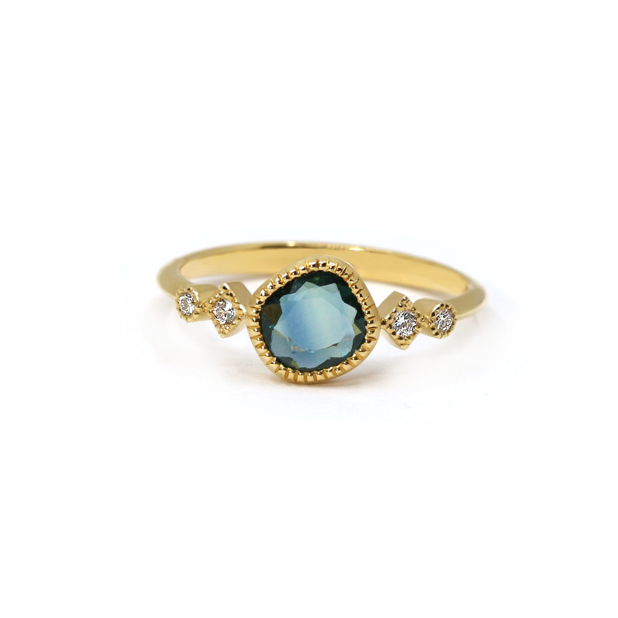 Cette bague en or jaune marie subtilement caractère brut et élégance raffinée. En son centre, un saphir de couleur teal, de taille irrégulière et plate, capte la lumière avec une profondeur envoûtante, oscillant entre bleu profond et vert intense. Sa forme organique lui confère une allure unique, presque minérale. Quatre diamants délicatement sertis autour de la pierre ajoutent des touches de lumière pure, contrastant avec les reflets changeants du saphir. L’or jaune, chaleureux et solaire, encadre l’ensemble avec finesse, mettant en valeur l’équilibre entre la spontanéité naturelle de la gemme et la précision des détails joailliers. Un bijou singulier.