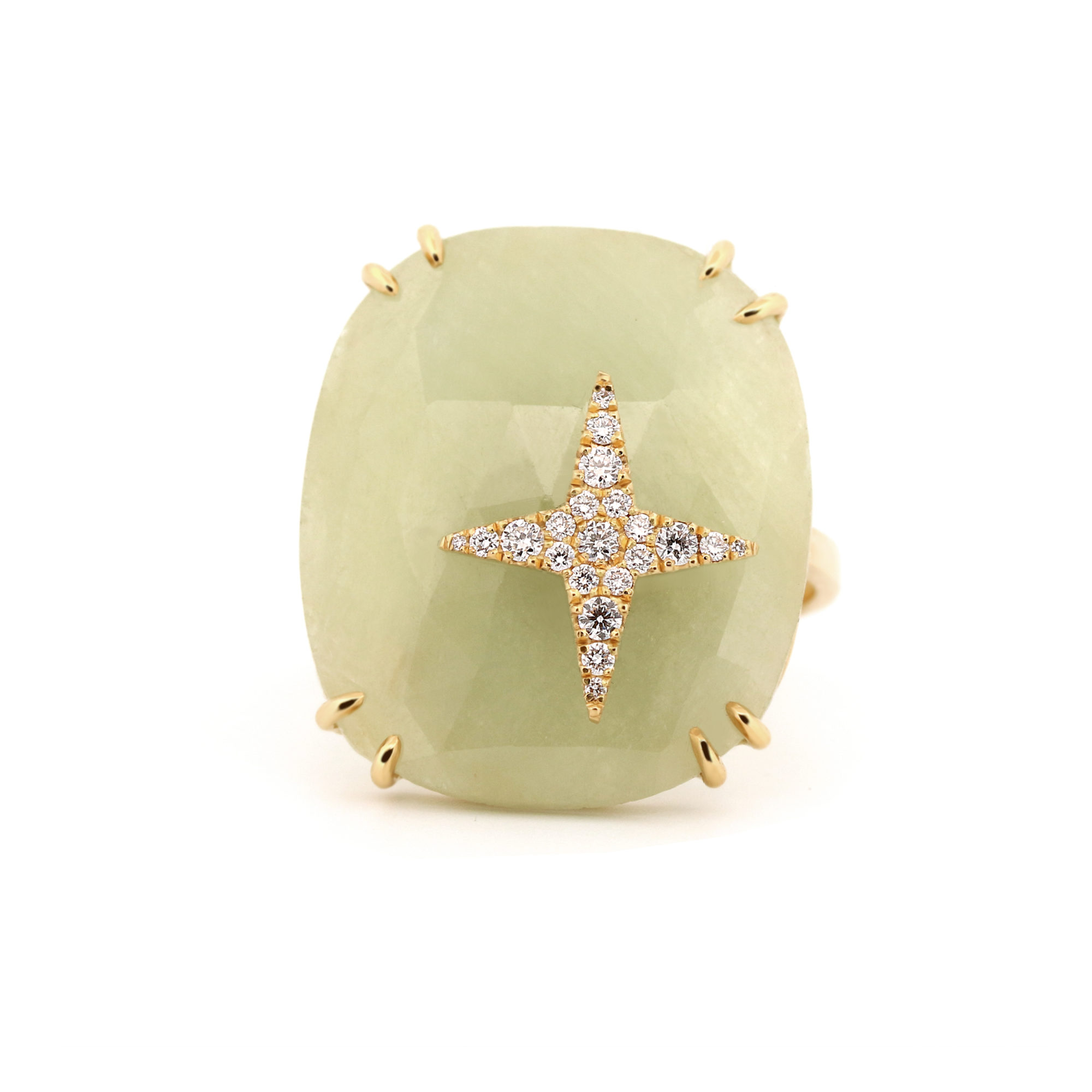 Cette bague en or jaune allie audace et délicatesse dans une composition unique. En son centre repose un saphir vert pâle brut, dont la texture naturelle évoque les forces sauvages de la terre. Sertie directement dans la pierre, une étoile étincelante pavée de diamants capte la lumière avec intensité, créant un contraste saisissant entre la rugosité du saphir et l’éclat des gemmes. L’or jaune, chaud et lumineux, enveloppe le tout avec élégance, soulignant la beauté brute de la pierre. Symbole de mystère et de raffinement, cette bague raconte une histoire céleste gravée dans la matière terrestre.