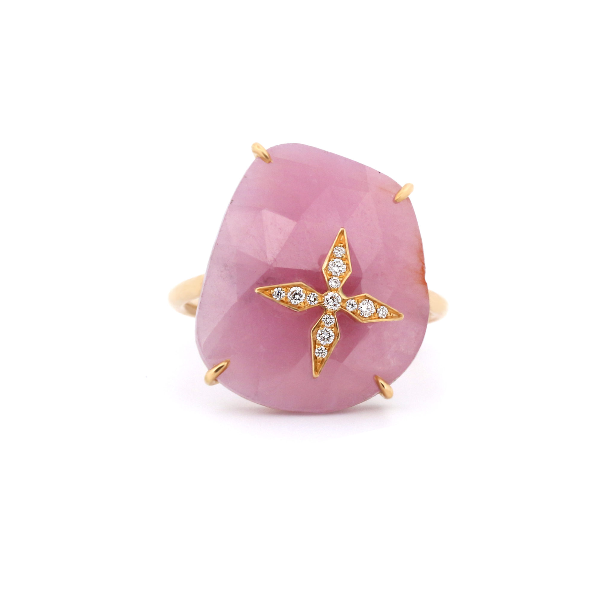 Cette bague magnifique en or jaune 18 carats met en vedette un saphir rose brut rehaussé d’une étoile en or sertie de diamants étincelants. L’éclat naturel du saphir rose brute contraste magnifiquement avec la précision des diamants, créant une fusion sublime de l’art brut et de la sophistication, un bijou d’une beauté exceptionnelle à porter au quotidien.