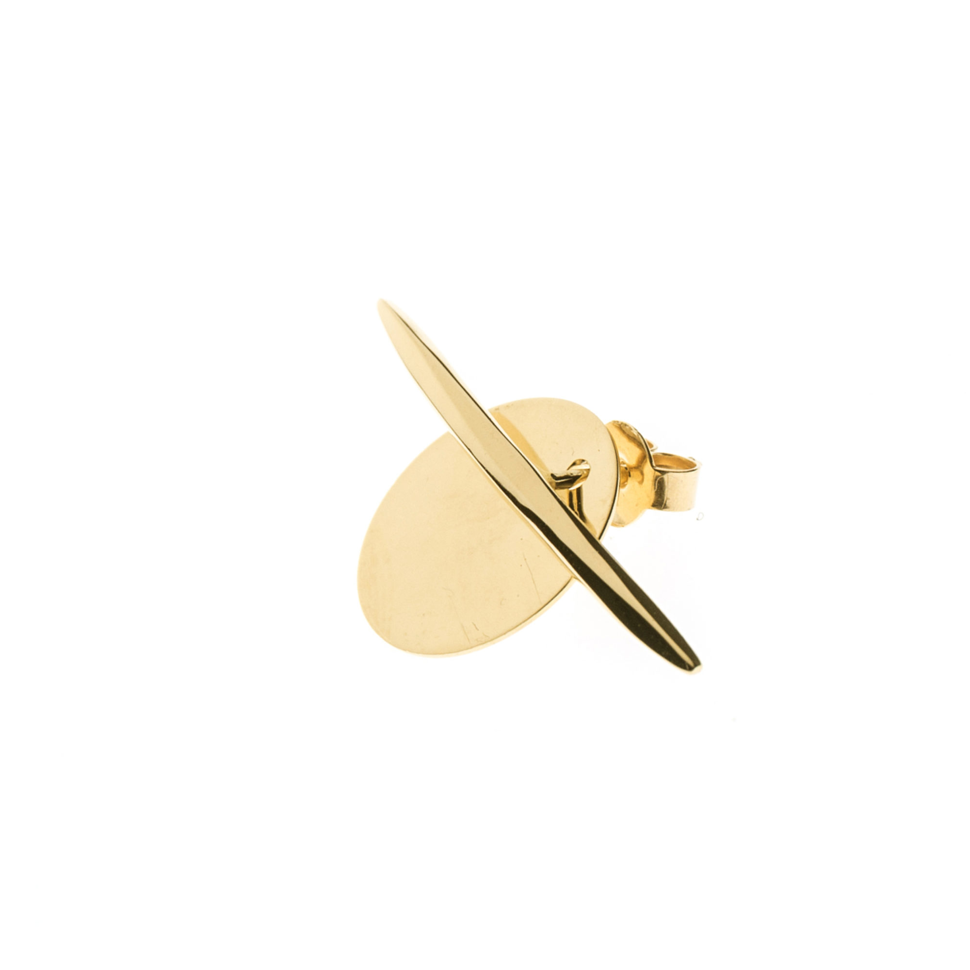Mono boucle iconique de la ligne Urban Tribe, est la signature principale des Rêveries d’Eve. En argent massif plaqué or jaune 18cts, son design pur et graphique se démarque par une forme délicatement facettée mi-polie et mi-diamantée. La boucle tire sa force de la pièce ronde polie qui se place derrière l’oreille et propose un jeu subtil entre l’avant et l’arrière du lobe.