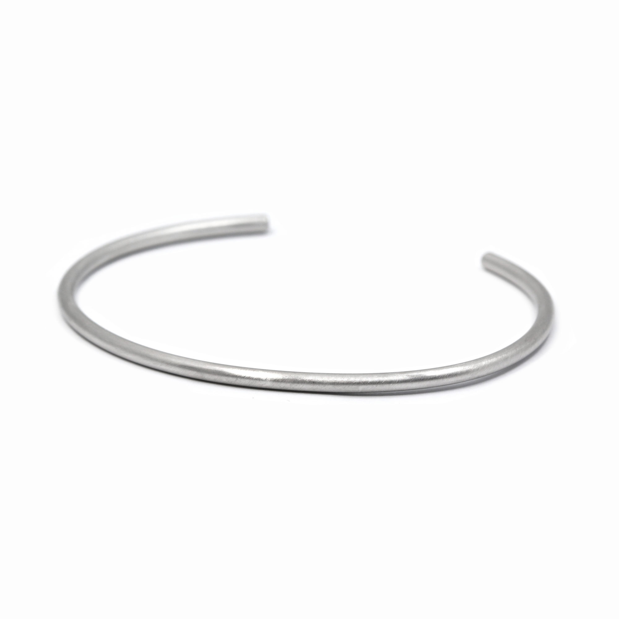 Élégant dans sa simplicité, ce bracelet jonc est réalisé en argent massif à partir d’un fil rond de 2,5 mm de diamètre, offrant une silhouette fine, épurée et confortable. Sa finition brossée confère à l’argent une texture mate et douce, subtilement satinée, qui capte la lumière avec discrétion.