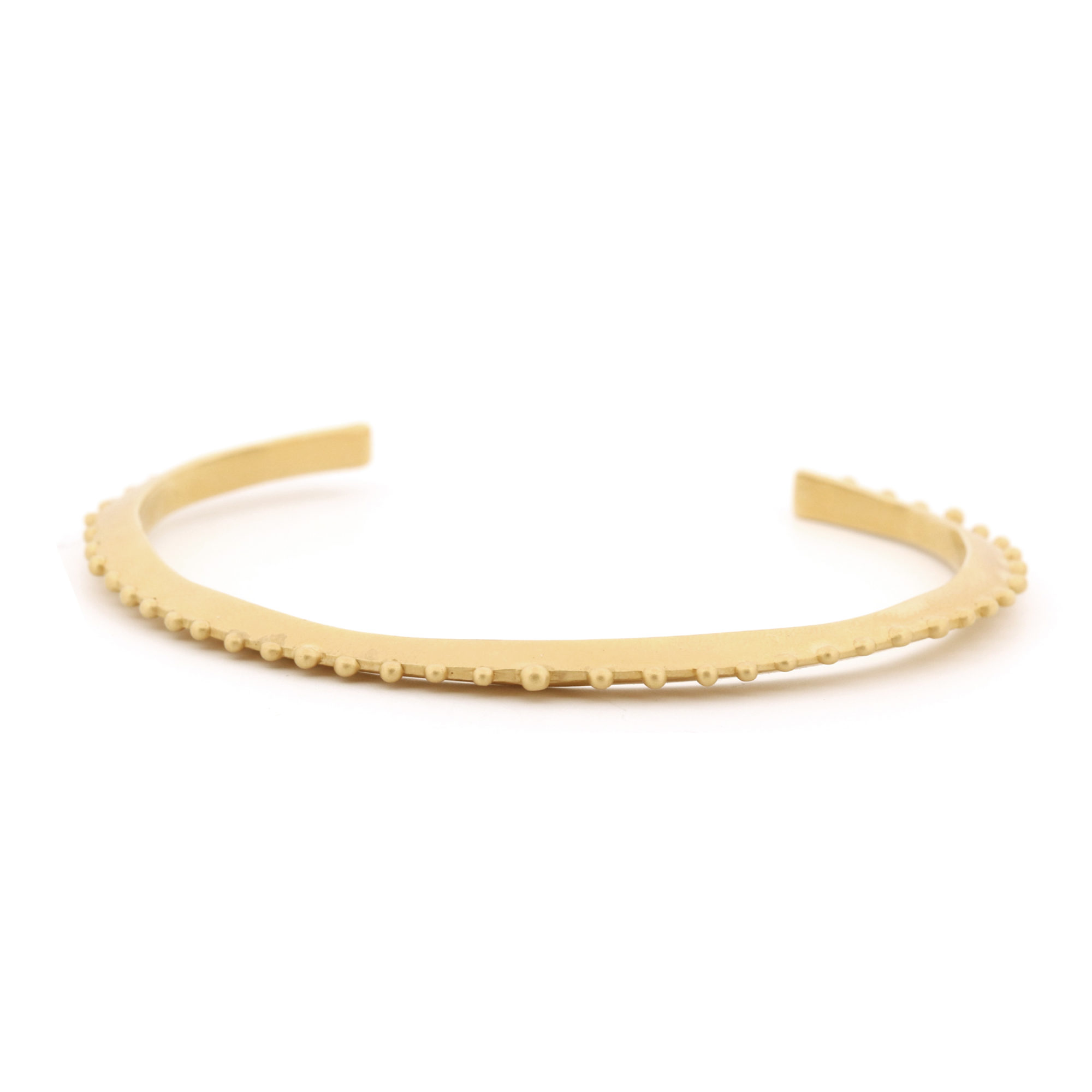 Ce bracelet jonc en argent massif plaqué or 18 carats séduit par sa forme large de 4 mm, à la fois solide et élégante. Sur sa ligne épurée viennent se poser de petites boules irrégulières, comme modelées à la main, évoquant des perles anciennes ou des fragments d’étoiles.