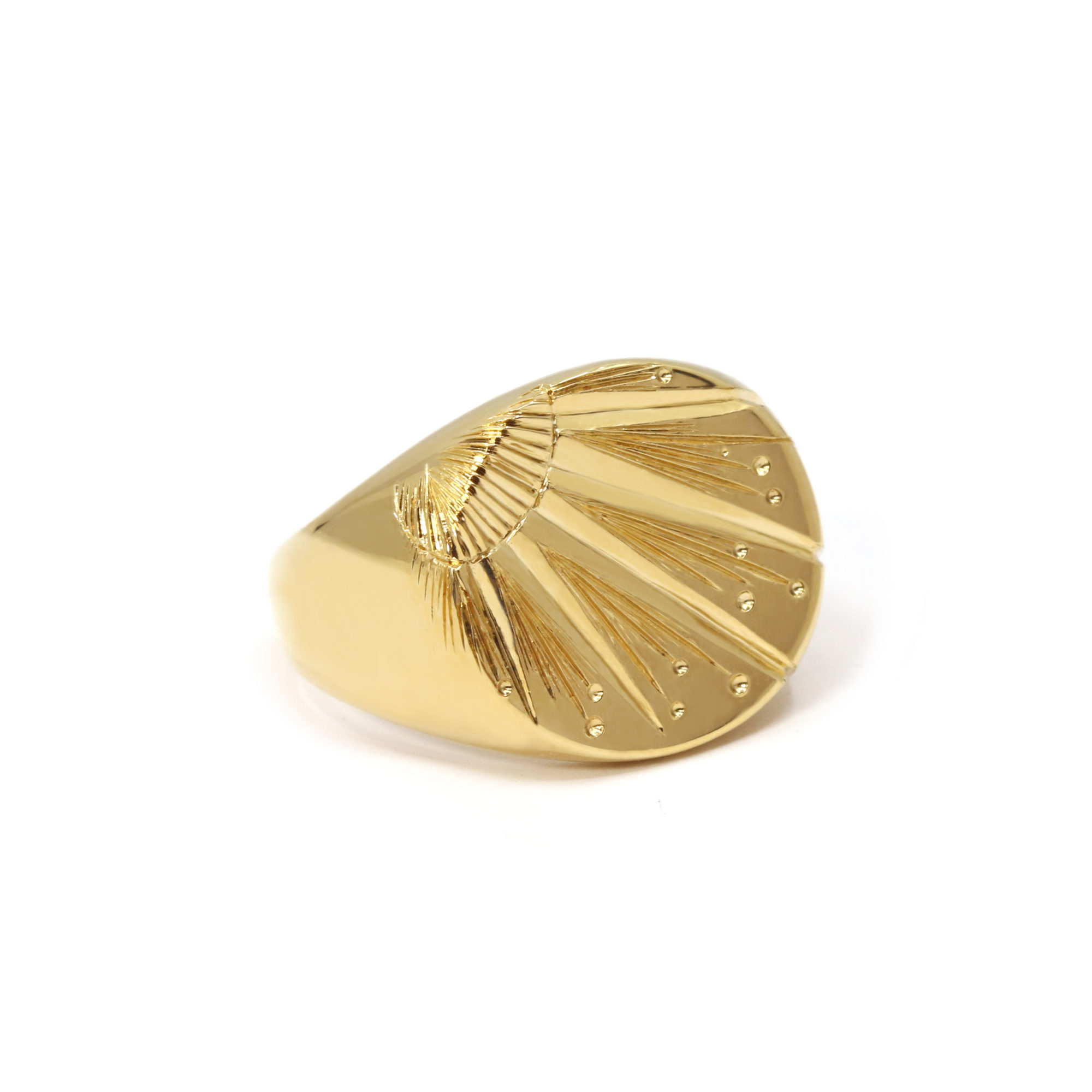 Très belle pièce en argent rhodié qui s’impose avec force et élégance. Cette chevalière tendance de la ligne Les Mystiques est gravée par un artisan genevois. Chaque pièces est unique et représente un soleil qui fait référence aux cartes du tarot.
