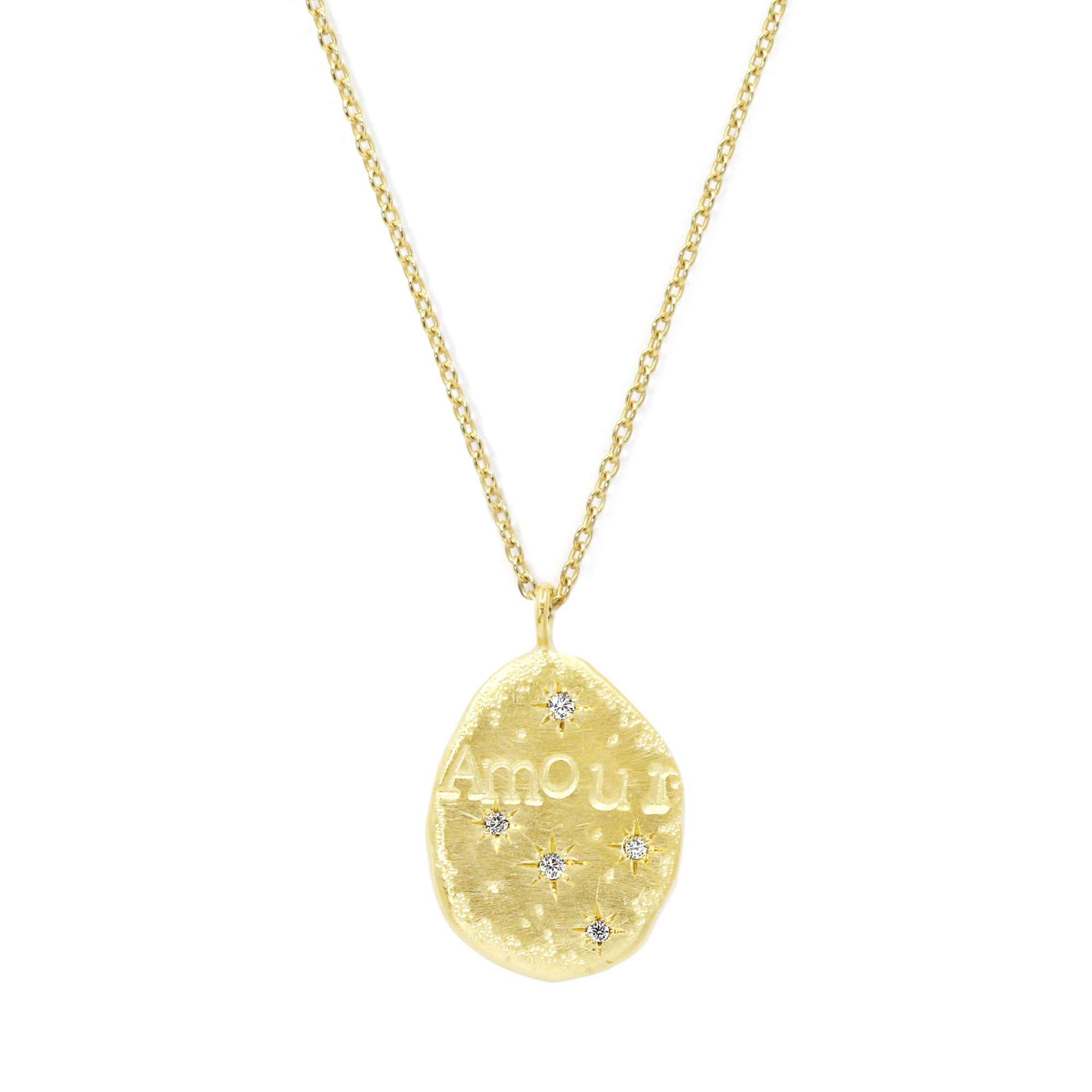 La médaille est ponctuée de zircons sertis en forme d’étoile, tels des éclats célestes. Elle est poinçonnée à la main du mot “Amour”, affirmé avec force et simplicité, faisant de ce bijou une déclaration intime et universelle.