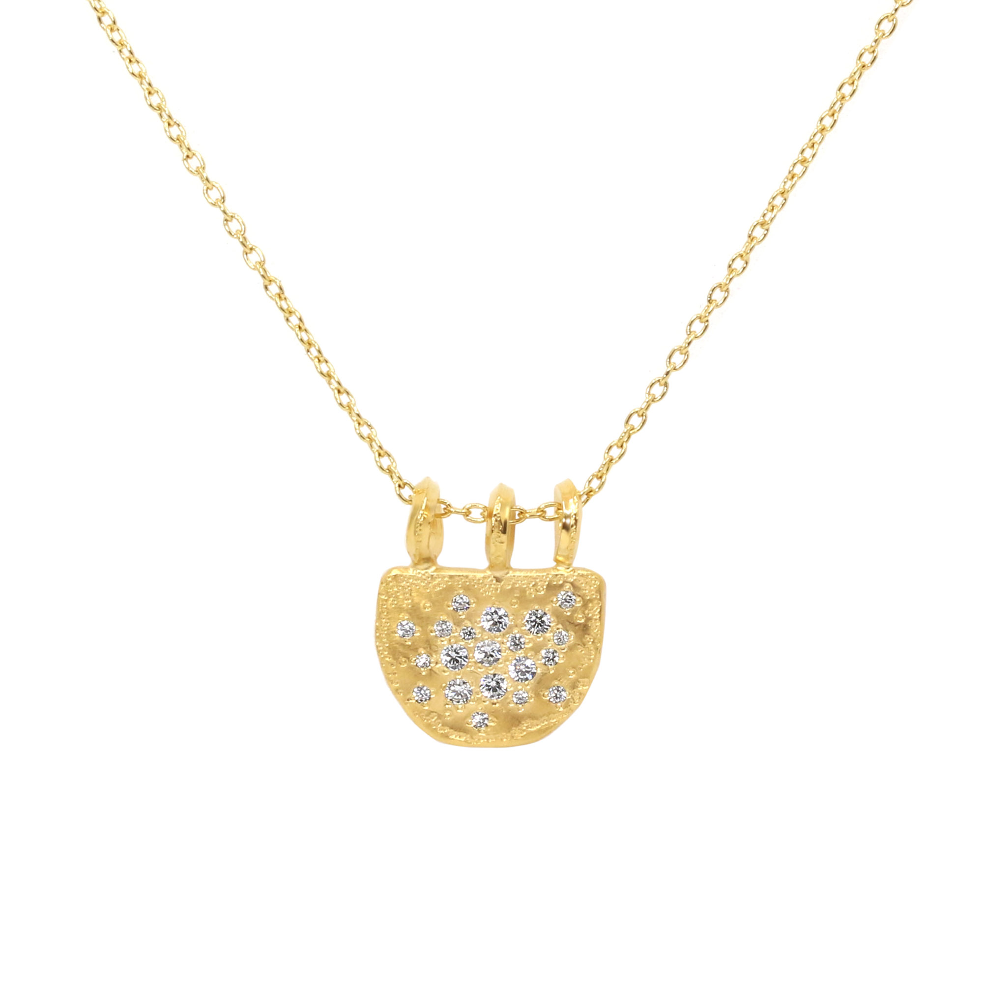 Ce collier en argent plaqué or jaune met en scène un petit cadenas, à la forme organique et irrégulière, comme façonné par le temps. Martelé à la main, il présente une finition mate et texturée, qui capte la lumière avec discrétion et intensité.