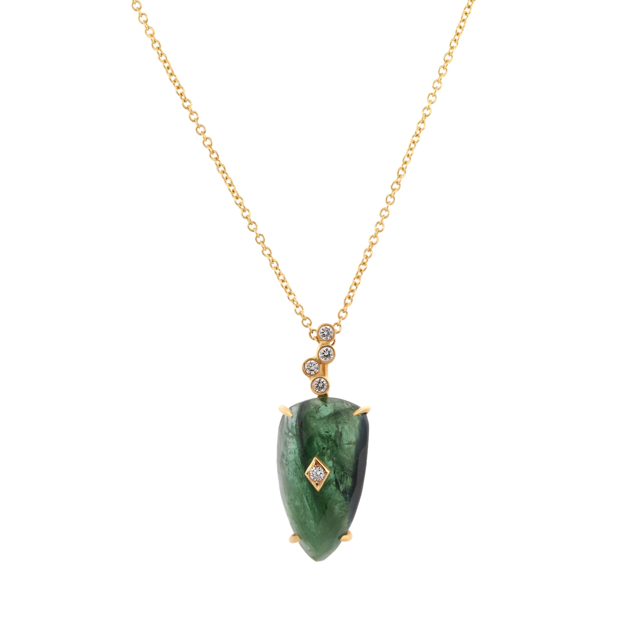 Magnifique collier en or 18ct et 5 diamants de qualité FG vs-si. La tourmaline est percée pour accueillir un beau diamants dans son écrin d’or.