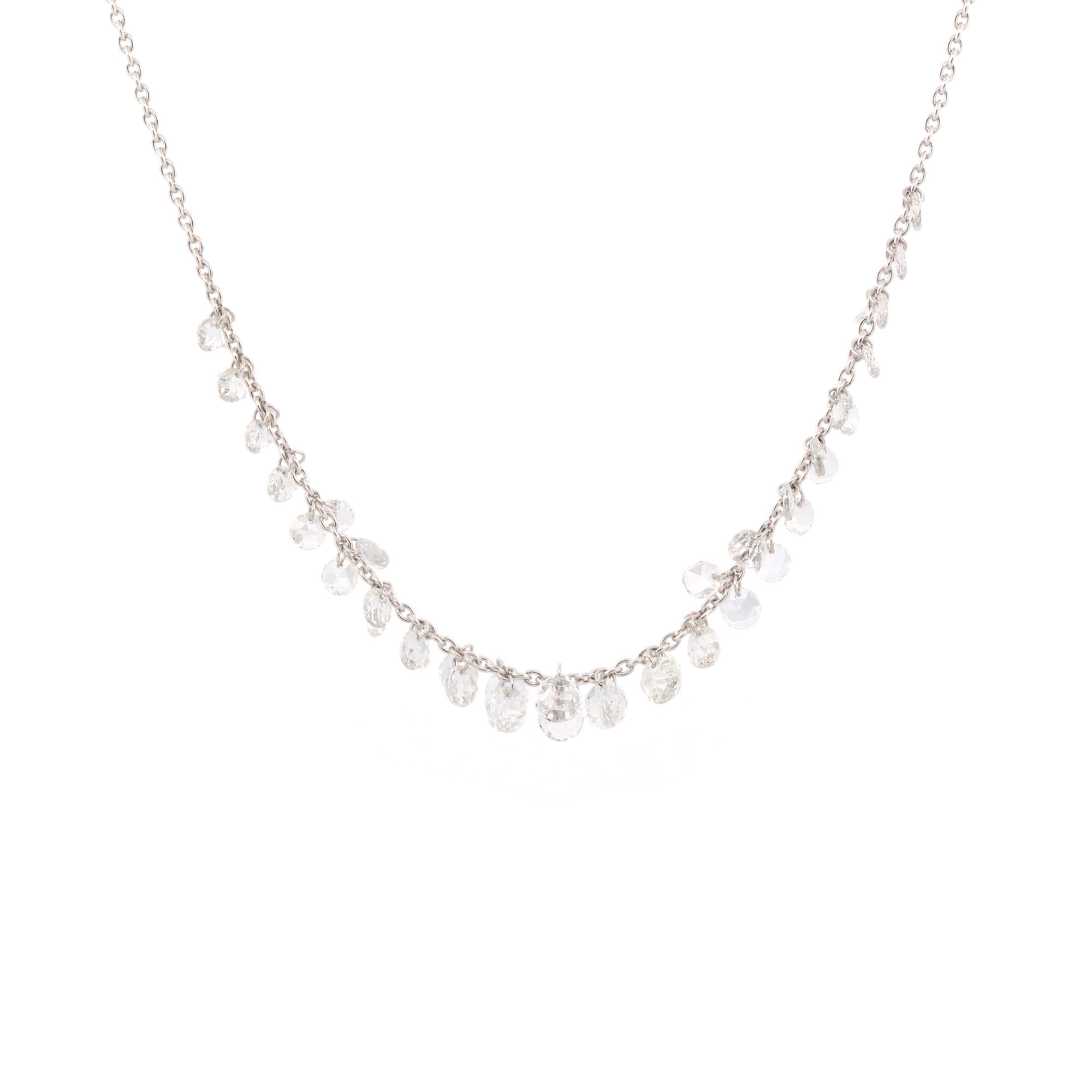 Ce somptueux collier en or blanc se distingue par l’éclat de 46 diamants en pampilles délicates. Chaque pierre, soigneusement suspendue le long de la chaîne, capte la lumière avec une grâce étincelante. L’or blanc 18 carats offre une toile lumineuse pour ces joyaux scintillants. L’ensemble évoque une sophistication contemporaine avec une touche ludique.