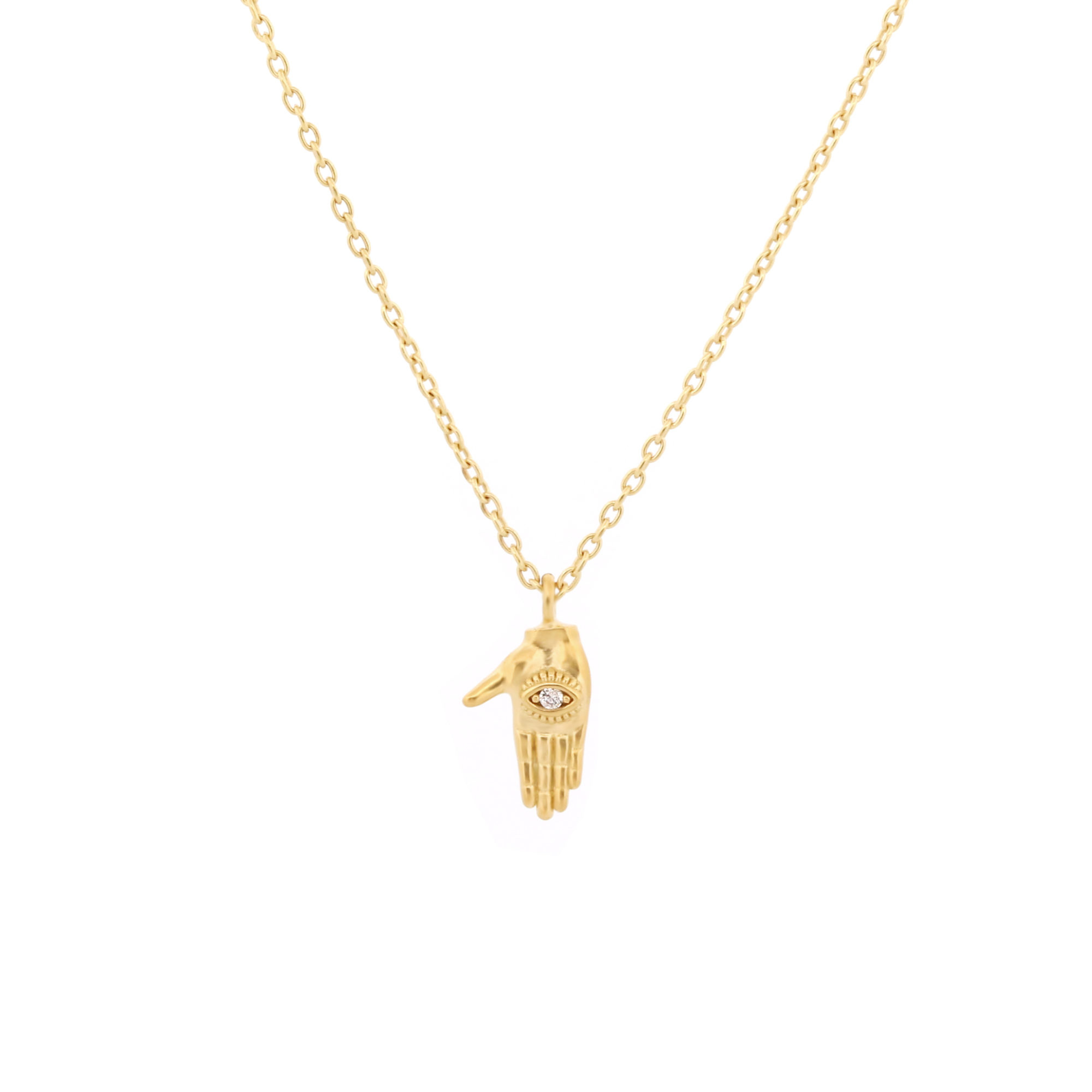 Ce collier en argent plaqué or jaune représente une petite main, au contour doux et à la surface légèrement polie, comme caressée par le temps. Discret mais puissant, ce symbole universel évoque à la fois la protection, la guidance et le don.