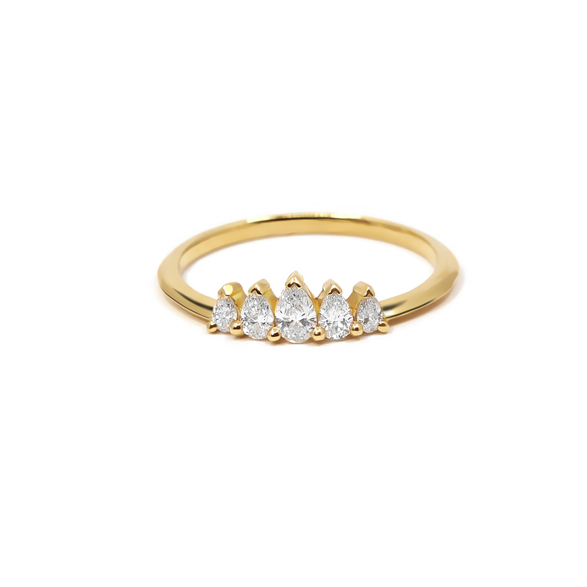 Cette alliance en or jaune 18 carats est surmontée en son centre de cinq diamants taille poire, délicatement disposés en dégradé de tailles descendantes, formant une silhouette graphique et aérienne qui évoque une couronne moderne.